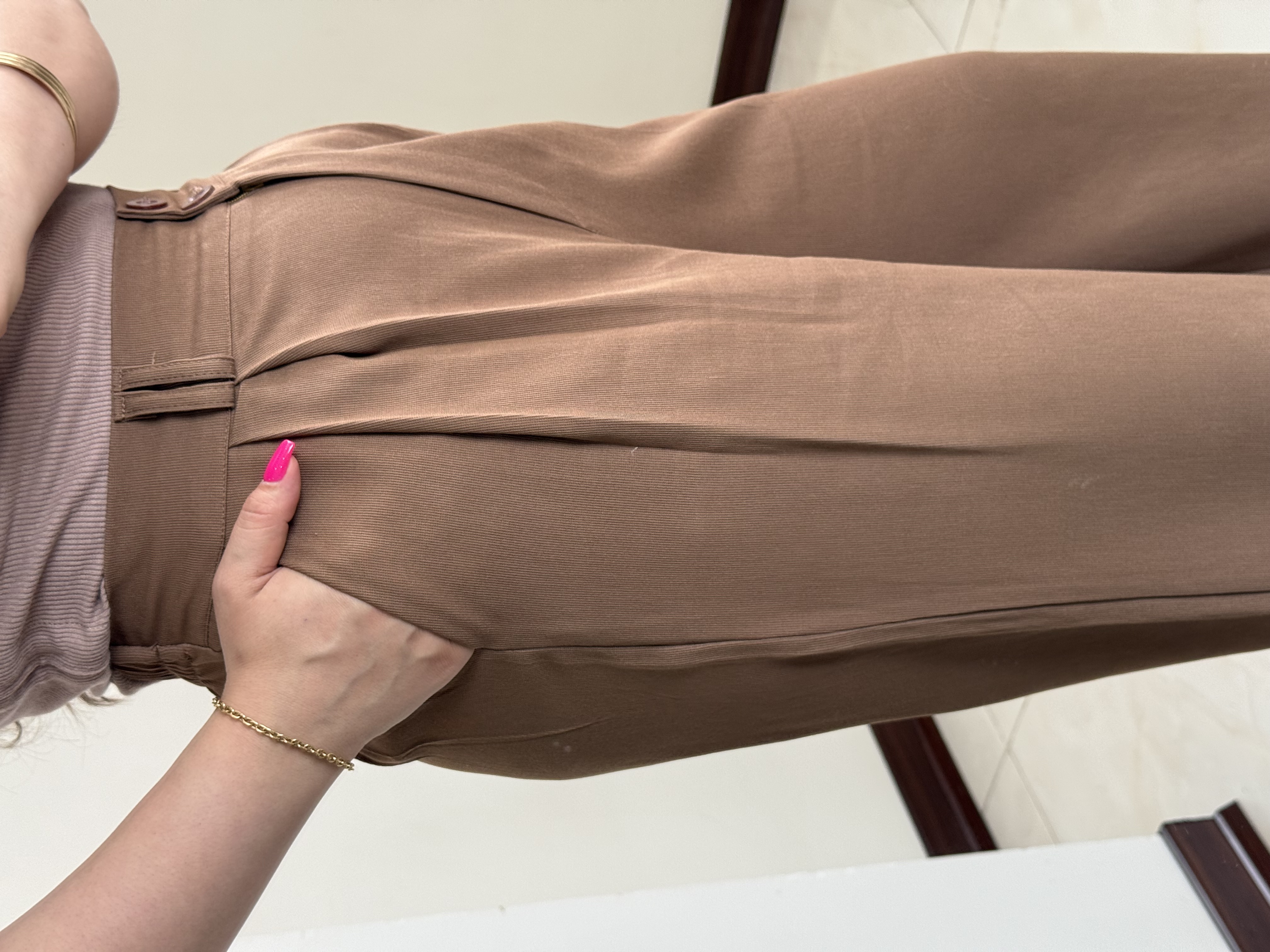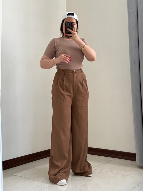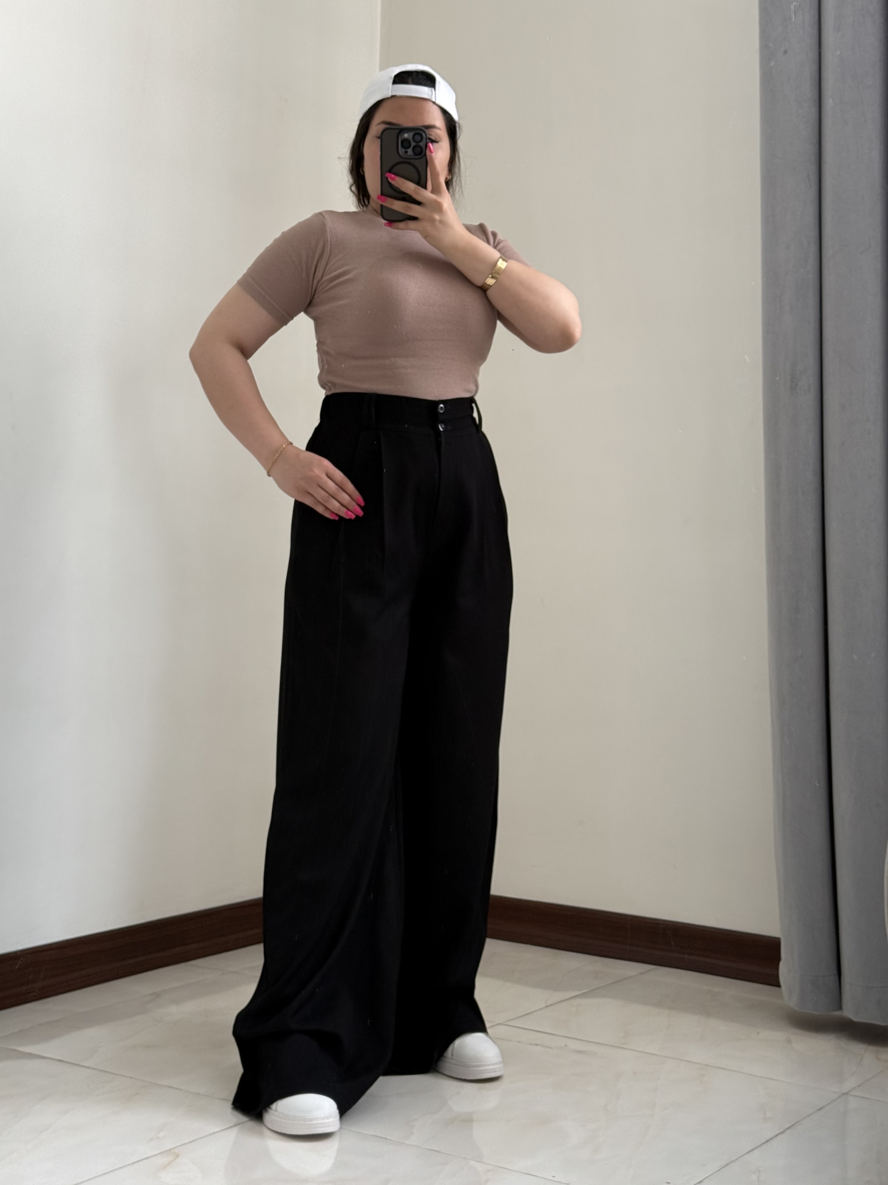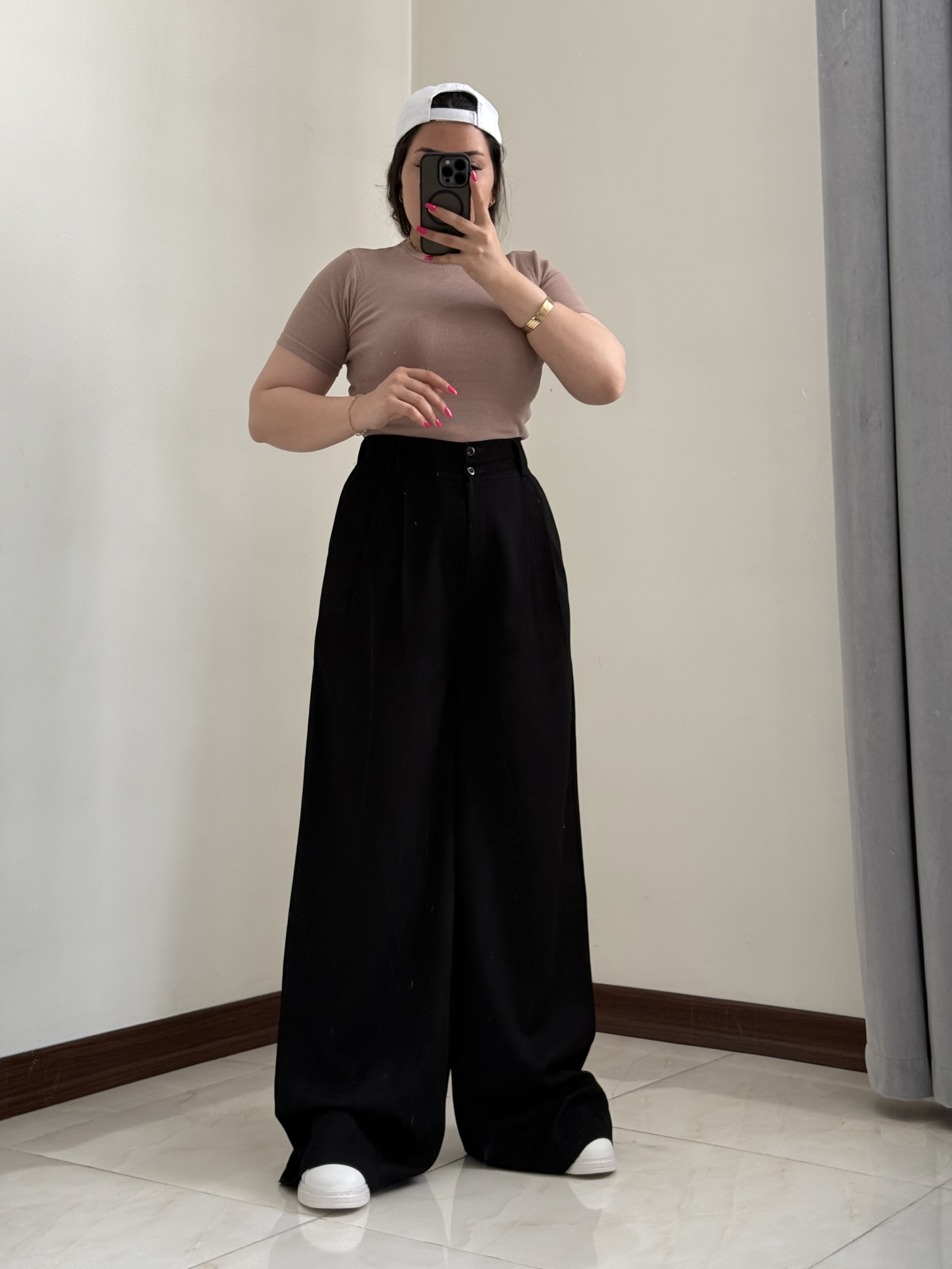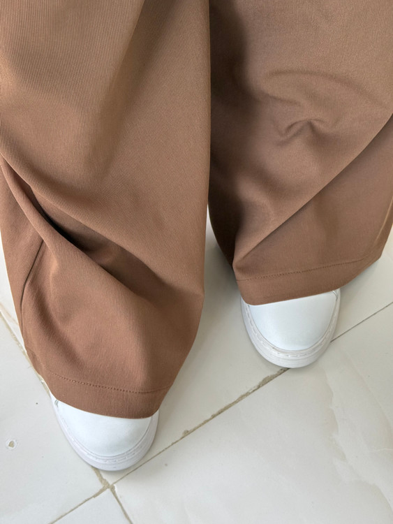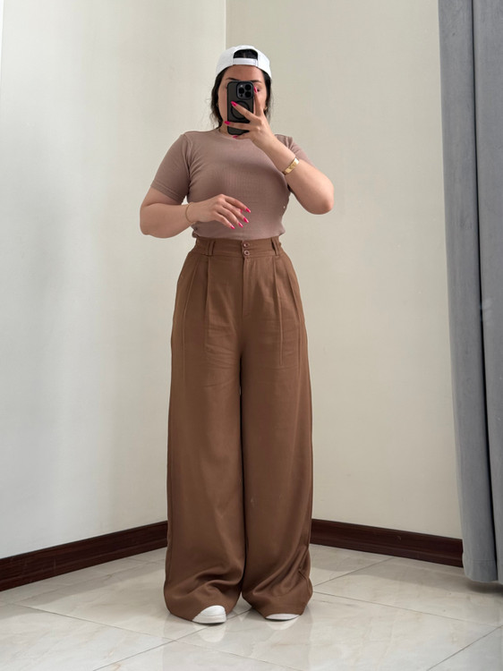 شلوار بگ پارچه ای زنانه جنسش ویسکوز هستش جلوی کار مدل پیله کار شده و دوتا جیب کاربردی داره جای کمربند هم داره وپشت کمر کش کار شده